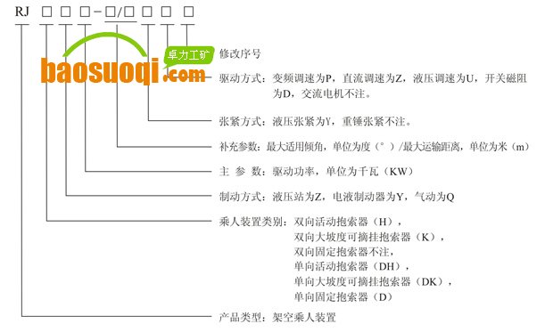 第一代架空乘人裝置型號(hào)示例:采用交流電機(jī)傳動(dòng)、電液制動(dòng)器制動(dòng)和重錘張緊、最大適用傾角26°、最大運(yùn)輸距離600m,驅(qū)動(dòng)功率為37KW的固定抱索器架空乘人裝置。其型號(hào)表示為: RJY37-26/600(A)。